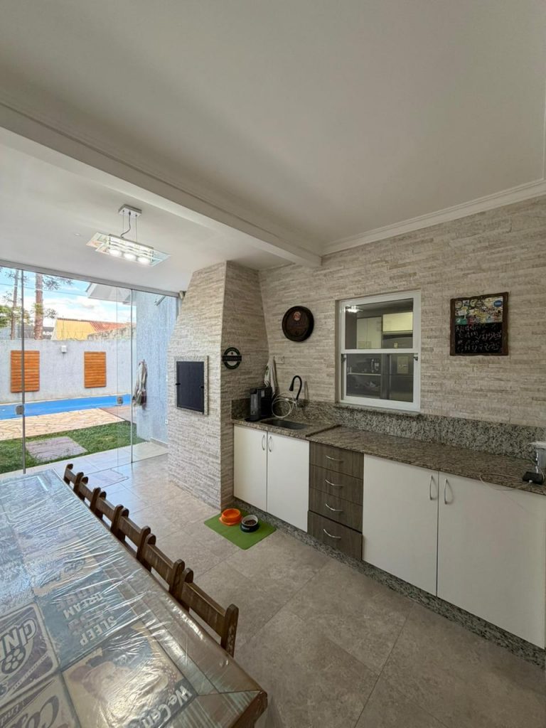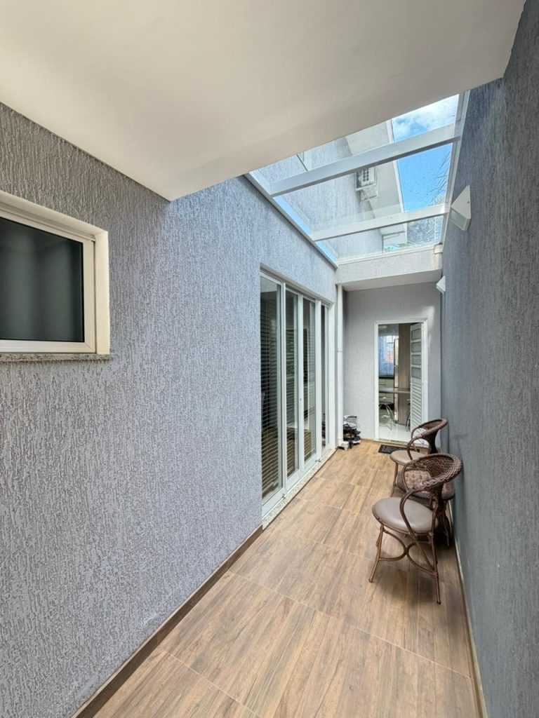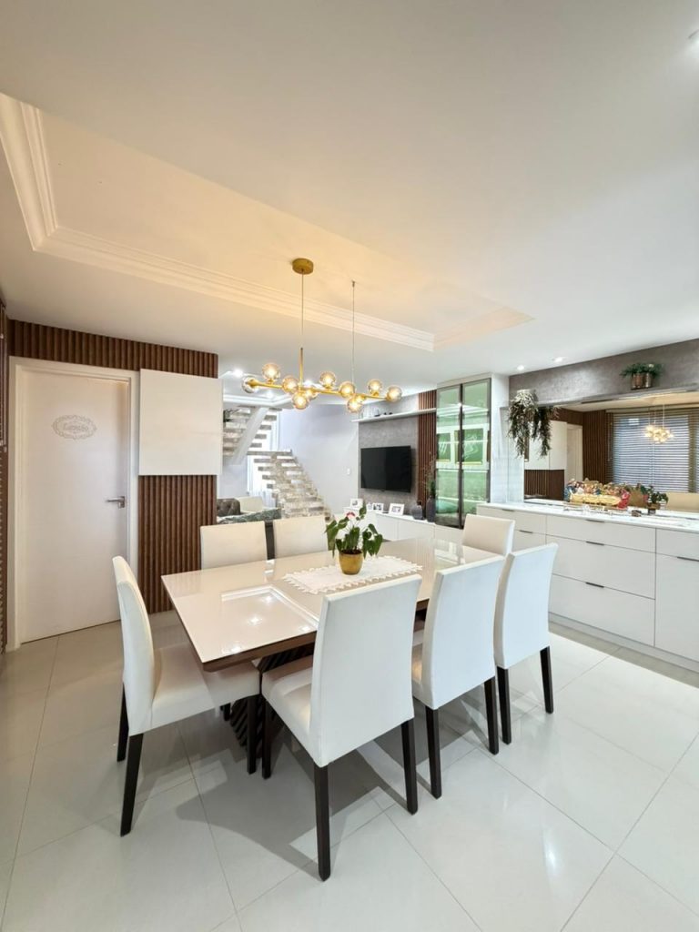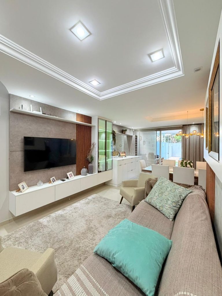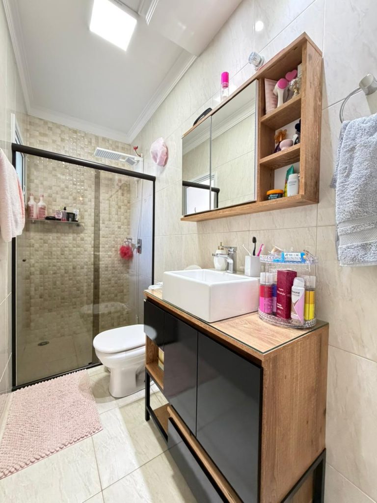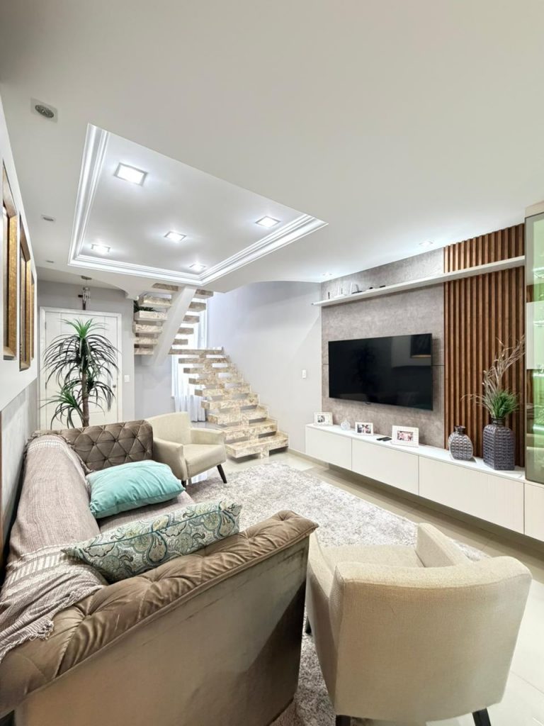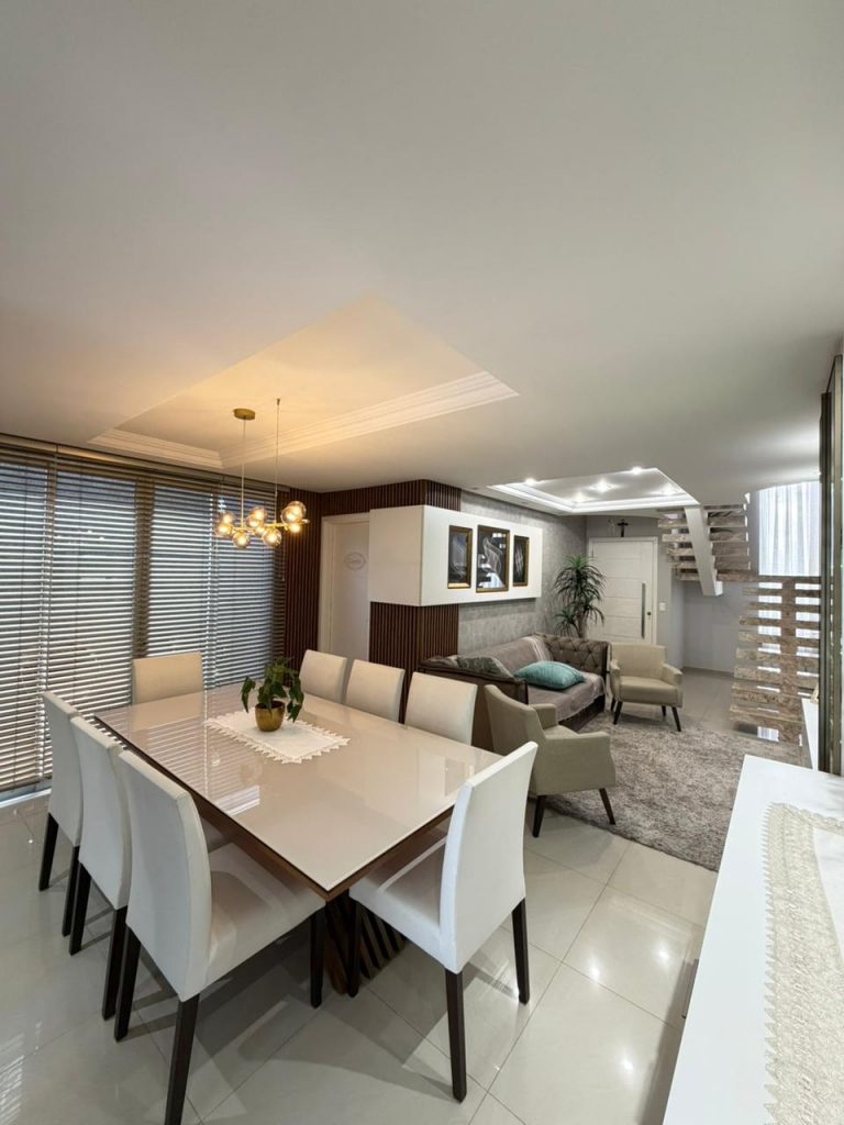 Possuindo 3 quartos, sendo uma suite e banheiro social na parte superior, e na parte térrea, temos sala de estar e jantar integradas, lavabo, cozinha, area gourmet com churrasqueira, area de serviço e piscina aquecida, garagem para 2 carros, sendo um deles coberto.